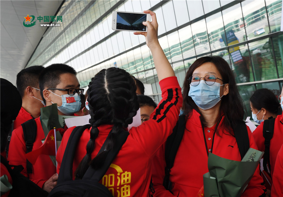 4月8日上午,吉林援鄂医疗队撤离武汉,队员在天河机场用手机拍下这难忘的时刻。解放军报记者 王传顺 摄