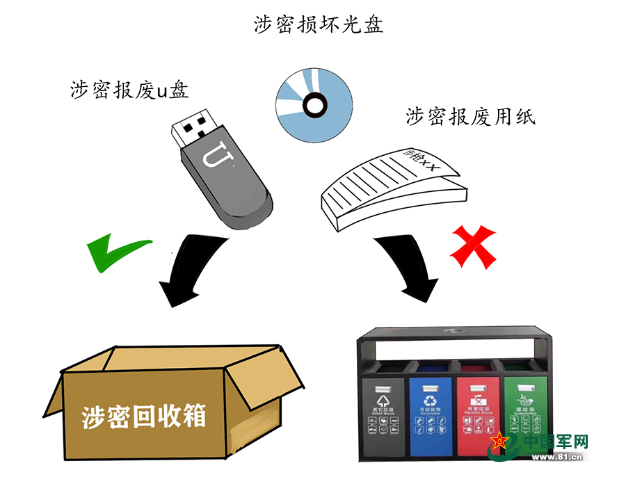 针对涉密物品管理,他们建立了涉密回收箱制度,规定日常工作中产生的废纸、损坏的硬盘U盘、用过的光盘等都要统一回收处理。