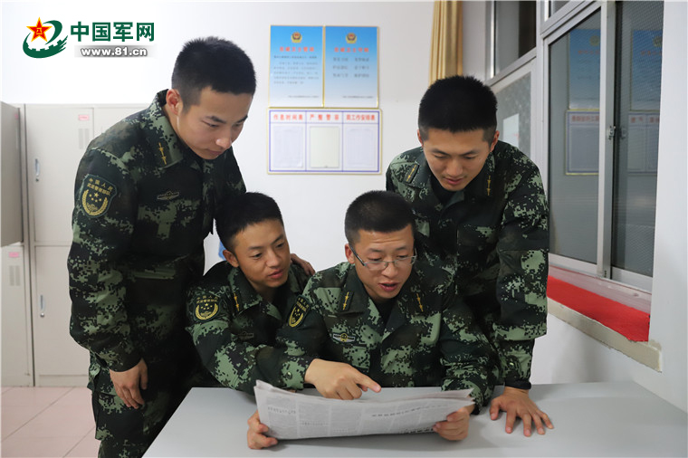 图为学员们正在学习军报上的最新热点理论。