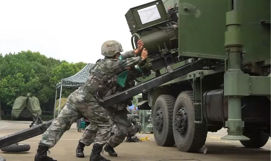 雷达修理课目中,战士们齐心协力将修好的发电机推上雷达车