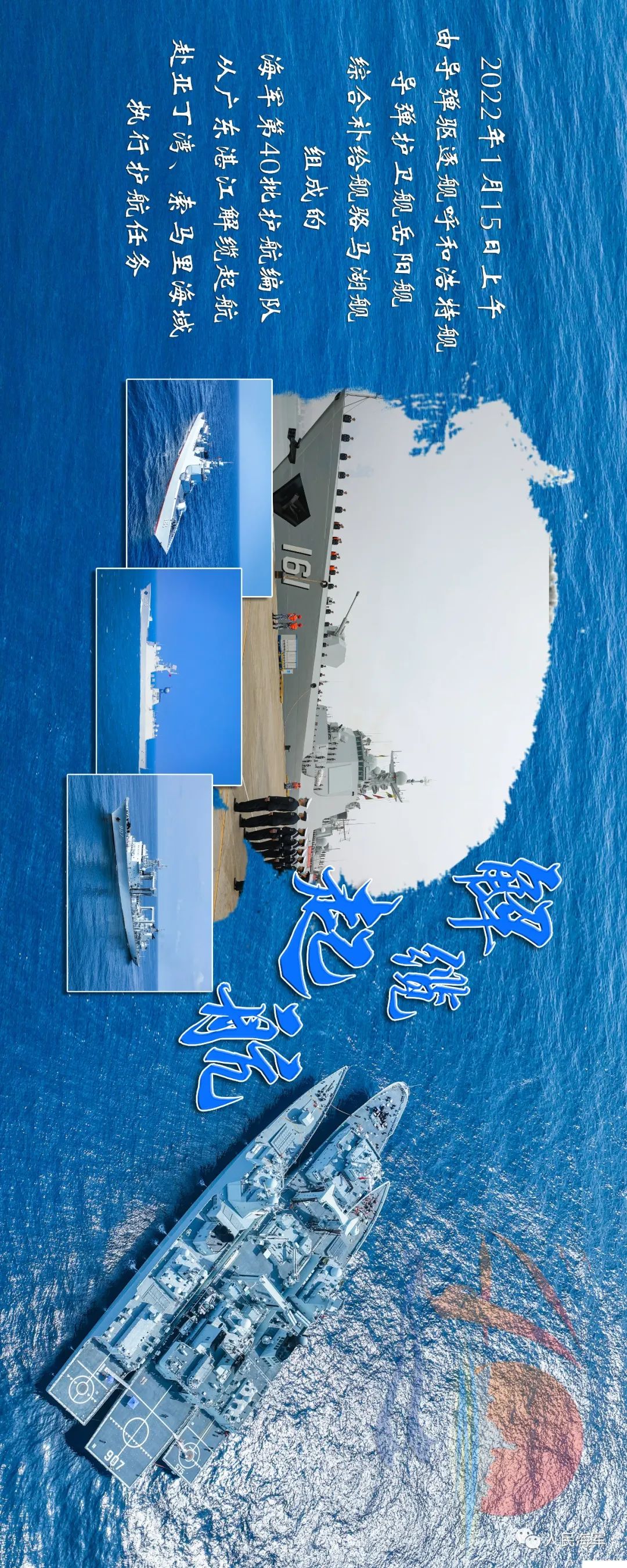 中国海军第40批护航编队由导弹驱逐舰呼和浩特舰、导弹护卫舰岳阳舰、综合补给舰骆马湖舰组成,1月15日由广东湛江某军港解缆起航。