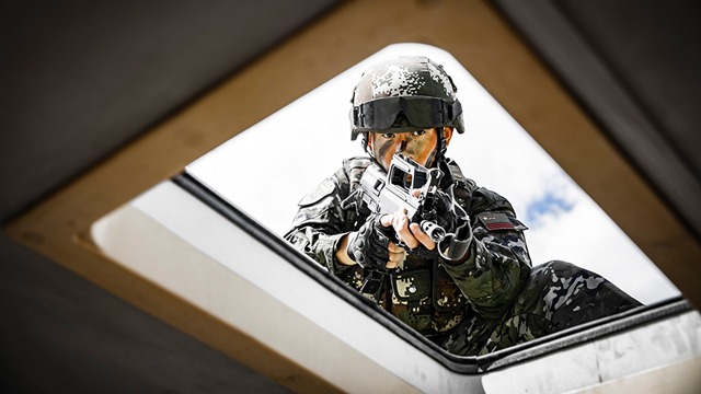 近日,浙江省温岭市810个“拥兵商家”挂牌亮相,现役军人、退役军人、基干民兵等可享受优待。图为民兵在一家企业出示专属优惠码。赵洪亮 摄
