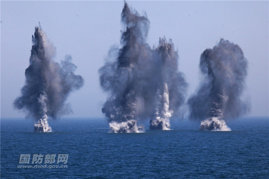 舟山舰实射火箭深弹爆炸瞬间。