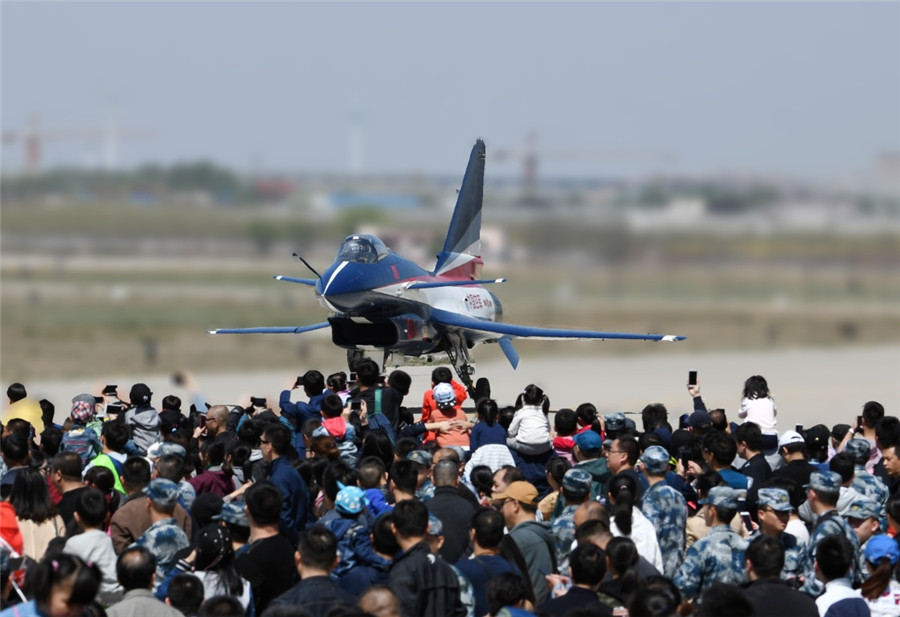 4月15日,在第三个全民国家安全教育日开放训练中,空军八一飞行表演队歼-10飞机滑出向民众致意。新华社发(刘川 摄)