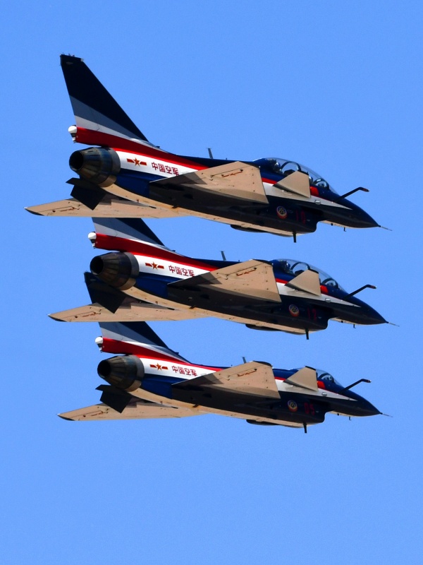 4月15日,在第三个全民国家安全教育日开放训练中,空军八一飞行表演队歼-10三机密集编队飞行。新华社发(刘川 摄)