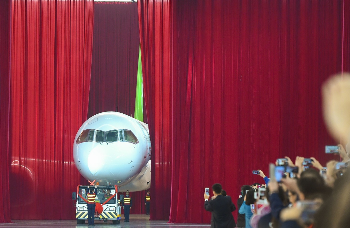 我国自主研制的C919大型客机首架机,在中国商飞公司总装制造中心浦东基地厂房内正式下线(2015年11月2日摄)。新华社发(裴鑫 摄)