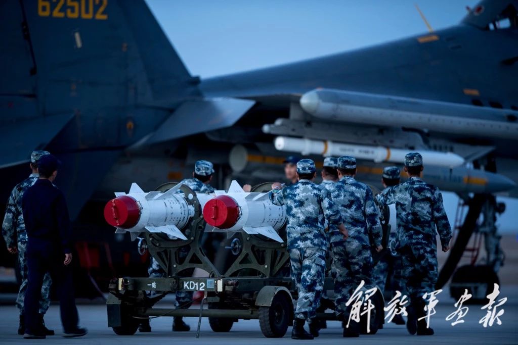 空战打响,蓝方地勤人员紧急为战机加挂导弹。