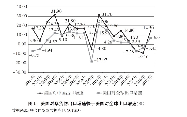 美国对华出口增速明显快于其对全球出口。中国加入世界贸易组织以来,美国对华出口快速增长,中国成为美国重要的出口市场。根据联合国统计,2017年美国对华货物出口1298.9亿美元,较2001年的191.8亿美元增长577%,远远高于同期美国对全球112%的出口增幅(图1)(注1)。