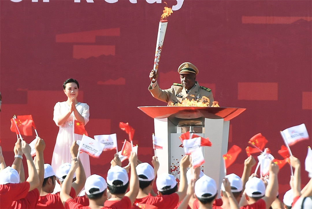 8月1日,国际军事体育理事会秘书长曼比·科伊塔(上右)在火炬传递仪式现场点燃第一支火炬。新华社记者万象摄