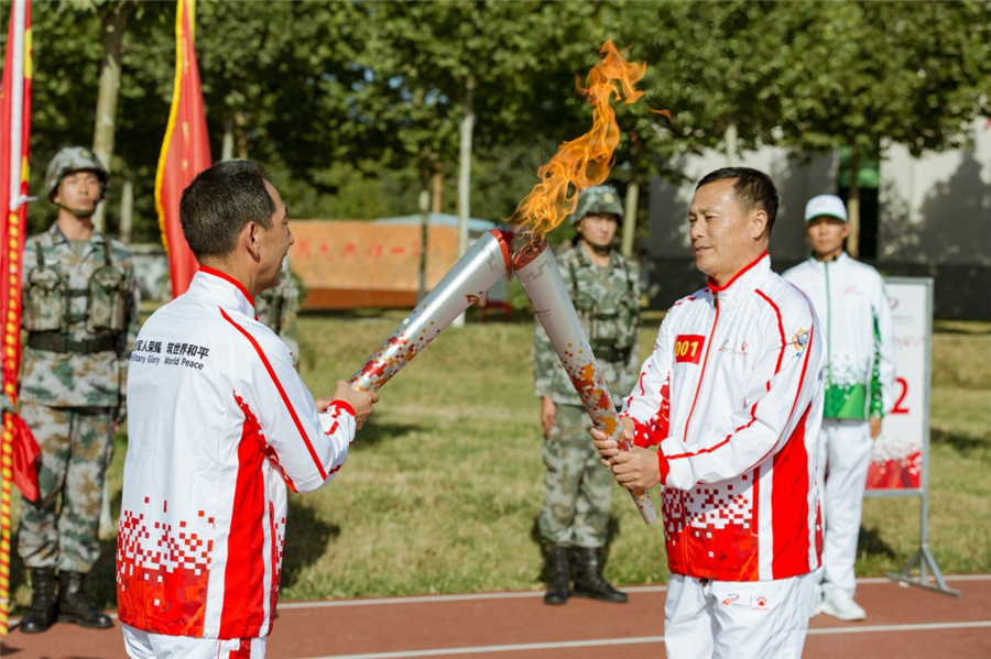 9月23日,第一名火炬手徐洪刚(前右)与第二名火炬手牛先民(前左)在火炬传递活动中交接。新华社 夏先杰摄