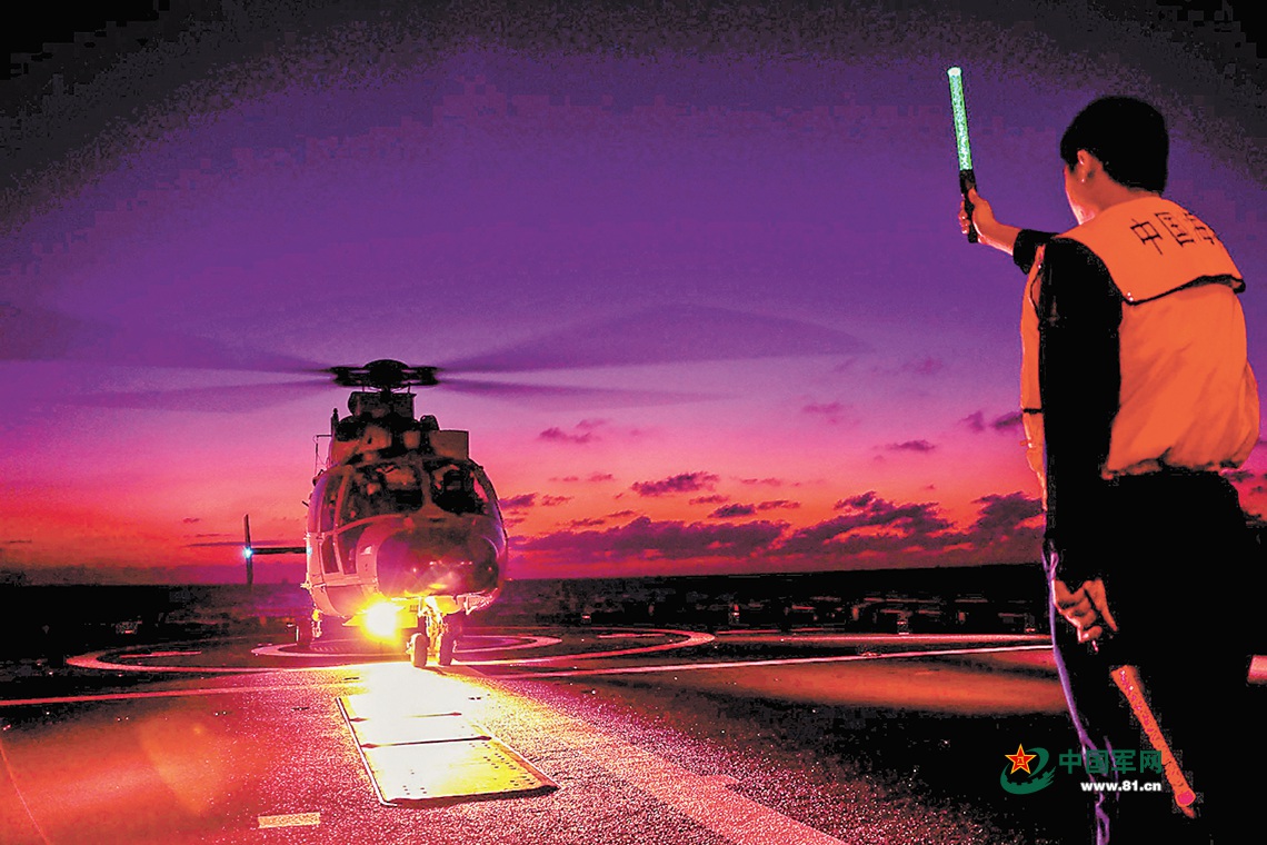 舰载直升机开展跨昼夜飞行训练。