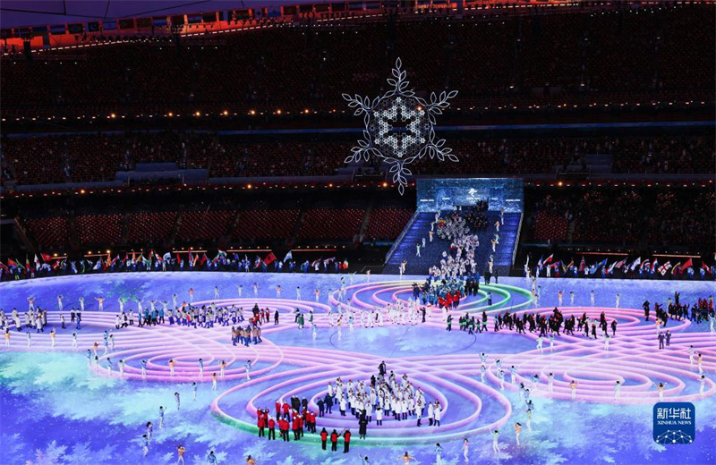2月20日晚,北京第二十四届冬季奥林匹克运动会闭幕式在国家体育场举行。这是代表团旗帜和运动员入场环节。新华社记者 王婧嫱 摄