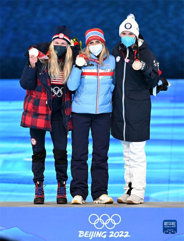 2月20日晚,北京第二十四届冬季奥林匹克运动会闭幕式在国家体育场举行。这是越野滑雪女子30公里集体出发(自由技术)冠军挪威选手特蕾丝·约海于格(中)、亚军美国选手杰茜·迪金斯(左)和季军芬兰选手凯尔图·尼斯卡宁在奖牌颁发仪式上。新华社记者 李尕 摄