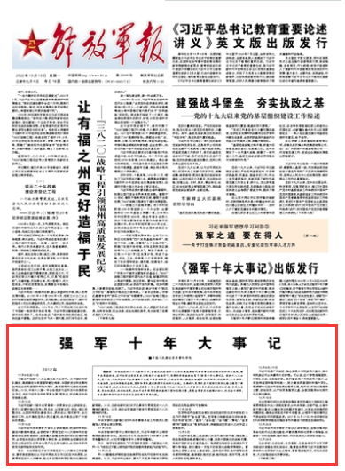 同日 习近平参观“领航强军向复兴—新时代国防和军队建设成就展”,强调党的十八大以来,国防和军队建设取得历史性伟大成就。英雄的人民军队在中国特色强军之路上续写了新的时代篇章,焕发出新的时代风采。要再接再厉,锐意进取,埋头苦干,奋力实现建军一百年奋斗目标,不断开创强军事业新局面,为实现中华民族伟大复兴提供战略支撑。