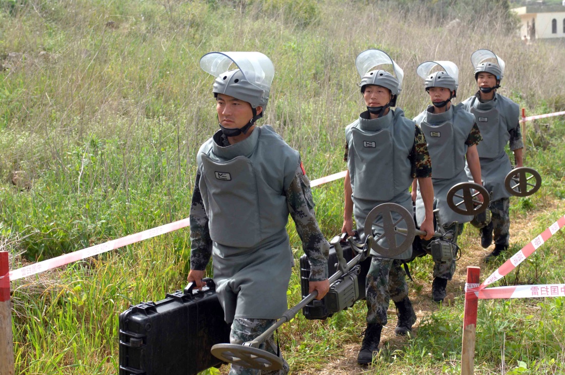 这张资料照片显示的是中国维和部队军人在黎巴嫩南部携装进入扫雷通道。