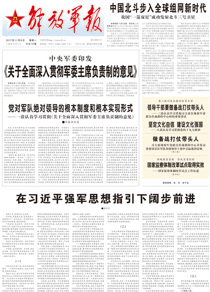 1982年12月4日,五届全国人大五次会议通过并公布施行经全面修改后的《中华人民共和国宪法》,其中规定,国家设立中央军事委员会,中央军事委员会实行主席负责制。2014年4月10日,中央军委印发《关于贯彻落实军委主席负责制建立和完善相关工作机制的意见》。2017年11月2日,中央军委印发《关于全面深入贯彻军委主席负责制的意见》。