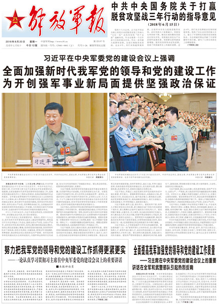 2018年8月17日,习近平在中央军委党的建设会议上讲话强调,全面加强新时代我军党的领导和党的建设工作,为开创强军事业新局面提供坚强政治保证。