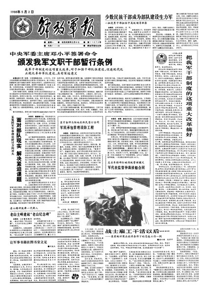 1988年4月27日,中央军委颁发《中国人民解放军文职干部暂行条例》。实行文职干部制度在人民解放军的历史上是第一次,是对军队干部制度的一项重大改革。