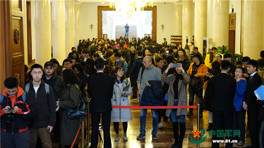 2月27日,全国政协十三届二次会议内地记者情况通报会在全国政协礼堂举行。这是排队领取参会证件的记者。中国军网记者孙智英 摄