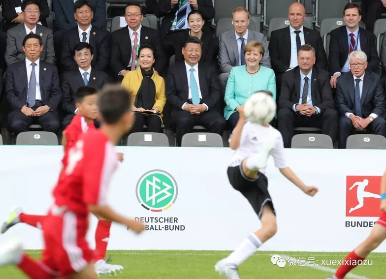 2017年7月5日,德国柏林奥林匹亚体育场,一场中德青少年足球友谊赛激战正酣。赛后,习近平走到球场中央,同双方小球员亲切交流,“你们是中德足球事业发展的希望,也是中德两国友好合作事业的接班人。希望你们发扬团结拼搏精神,学习和交流足球技巧,成为好朋友、好伙伴。”