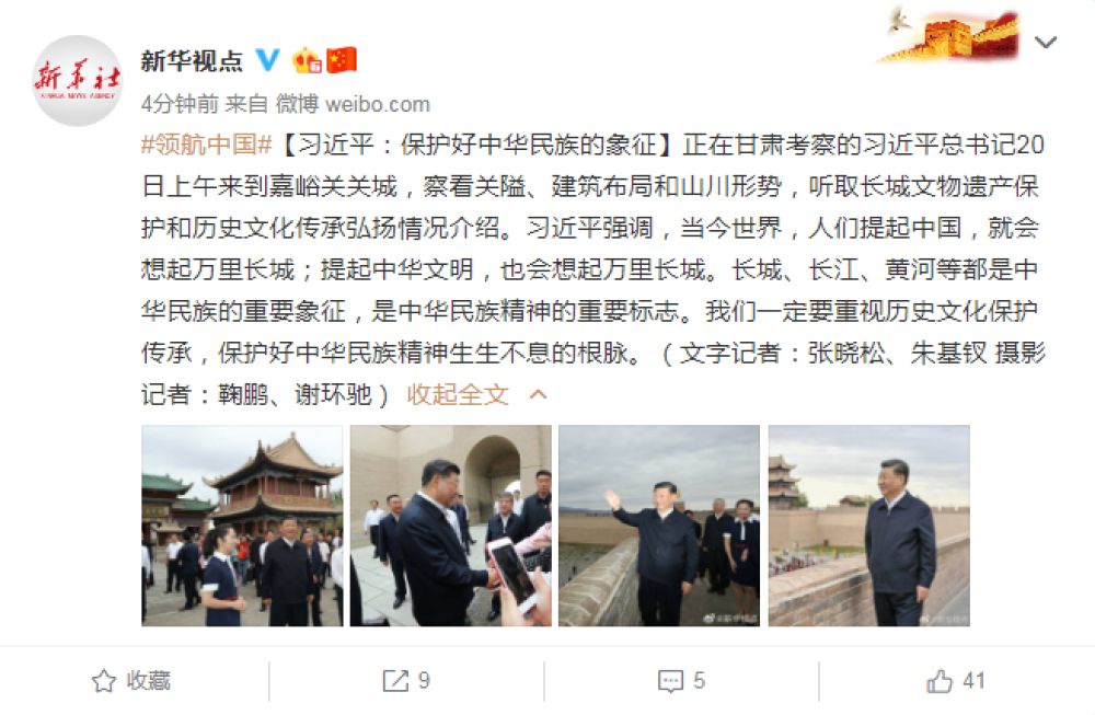 【习近平:保护好中华民族的象征】正在甘肃考察的习近平总书记20日上午来到嘉峪关关城,察看关隘、建筑布局和山川形势,听取长城文物遗产保护和历史文化传承弘扬情况介绍。习近平强调,当今世界,人们提起中国,就会想起万里长城;提起中华文明,也会想起万里长城。长城、长江、黄河等都是中华民族的重要象征,是中华民族精神的重要标志。我们一定要重视历史文化保护传承,保护好中华民族精神生生不息的根脉。
