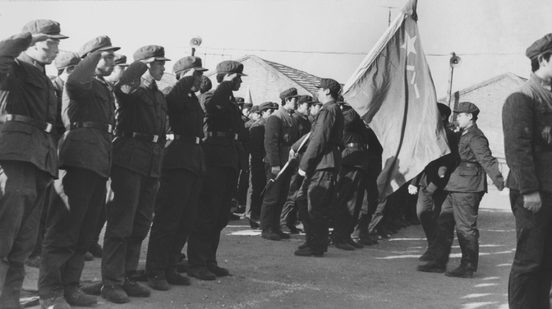 1984年,铁道兵部队集体转业并入铁道部。这是铁道兵向八一军旗告别(资料照片)。新华社发