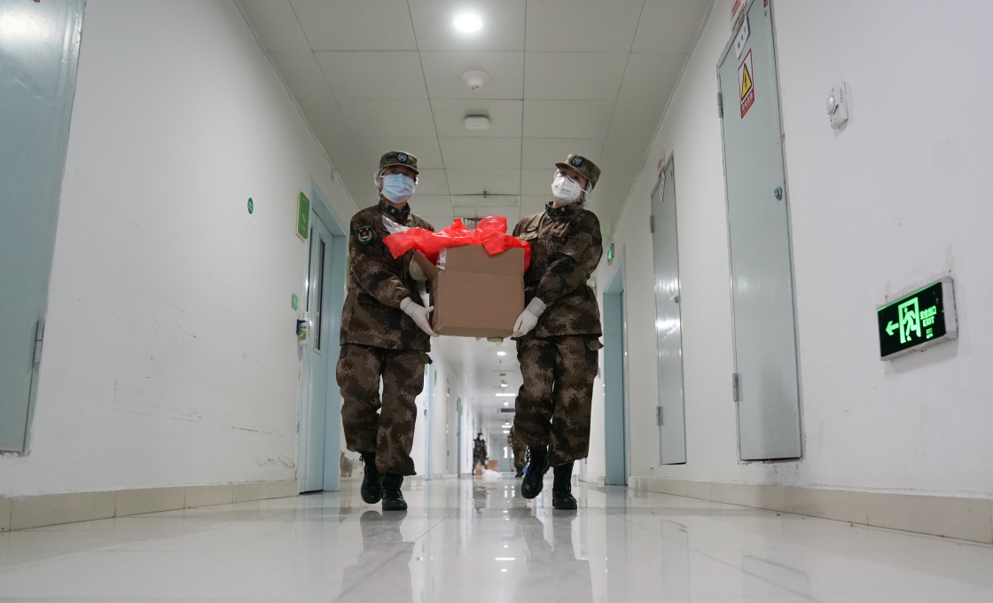 1月26日,在武汉市金银潭医院,陆军军医大学医疗队在搬运物资。新华社记者 程敏 摄