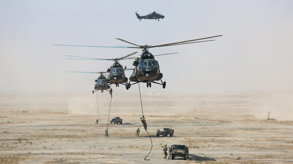 随着我新型无人机对企图逃逸的“恐怖分子头目”完成远程定点打击,实兵行动演练宣告结束。短短40分钟时间,在48平方千米的实兵演练区域,中俄参演兵力相继完成近30个作战行动,发射各类弹药数百吨,展示了两军遂行联合反恐行动的强大能力。